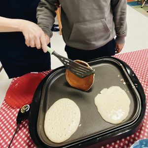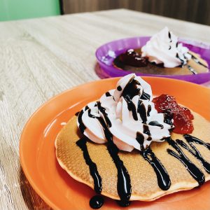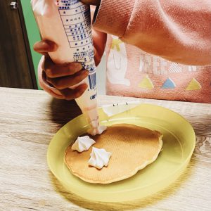 おやつは、自分たちでパンケーキを焼いて好きな盛り付けをして