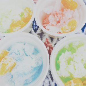フランクフルトのケチャップを自分達でかけて、かき氷はシロップを選んで練乳も。