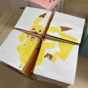 キャラクターが印刷された用紙を牛乳パックに貼っていくのですが、
