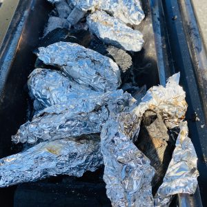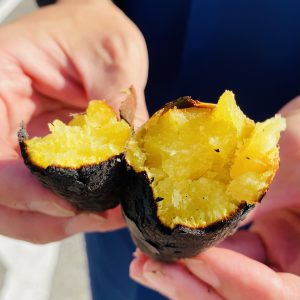 焼きたてホクホクのサツマイモを、青空の下で食べました。