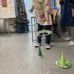 まずは、利用者さんが制作してくれたクリスマスをモチーフにした輪投げ、
