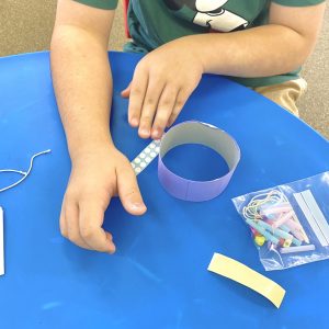 一生懸命ビーズとストローを通して、オリジナルのモビールを作りました!