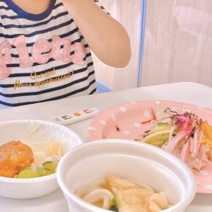 今回のメニューは、華やかにちらし寿司・ミニうどん・サラダ・唐揚げです💖