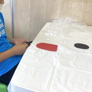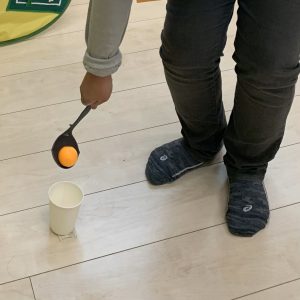 目玉のシールが貼ってあるピンポン玉をゴールまで運ぶ速さを、お友達と協力して競います!