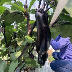 ナスやトマトのハウスを見学し、9月に苗植えする予定のイチゴハウスも見て回りました。