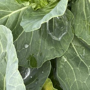 前日の雨がキャベツの葉の上に、きれいな水たまりを作っていました。